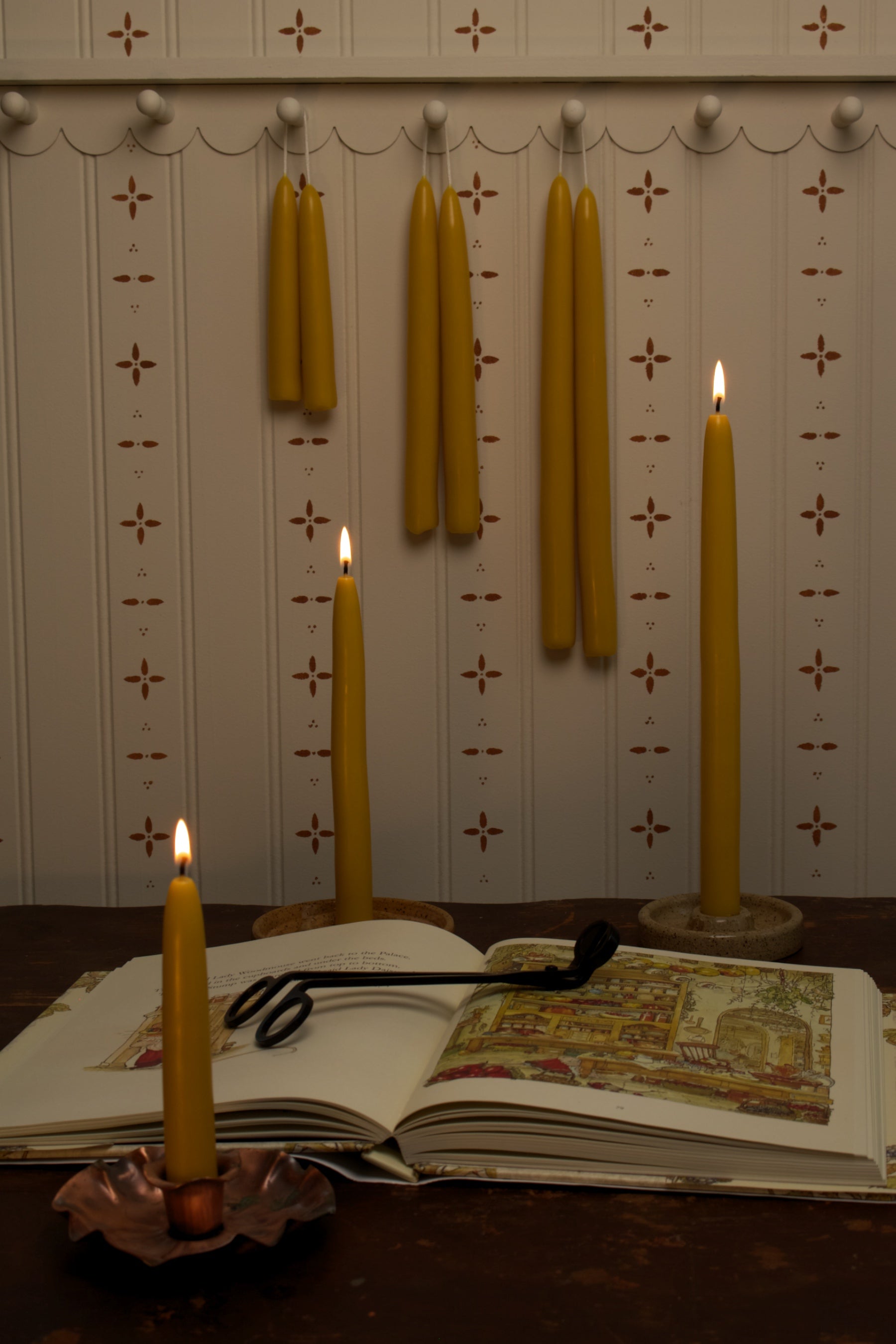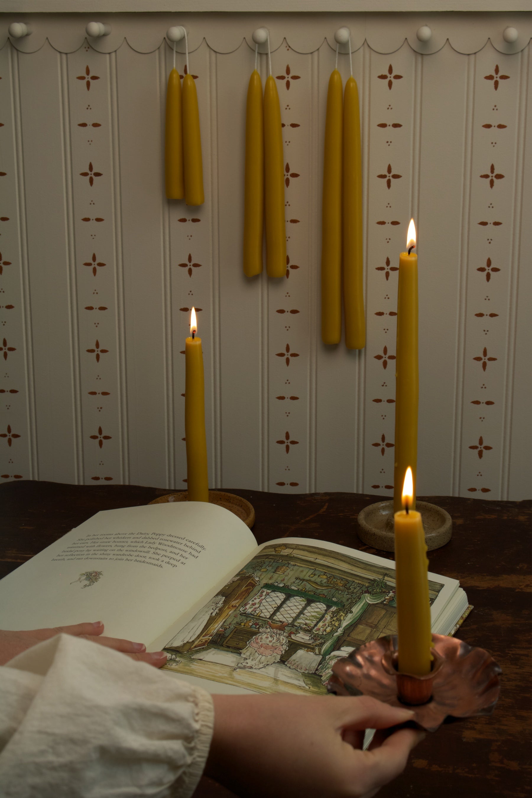 Crafted one dip at a time, these hand-dipped beeswax tapers invite you to slow your pace and savor the moment. Whether it's around the dinner table or illuminating a book from your beside - lighting it becomes an act of intention, presence, and calm. Made from pure beeswax, it burns cleanly and steadily, turning everyday pauses into something meaningful. Sold as a pair of two candles connected by their wick.